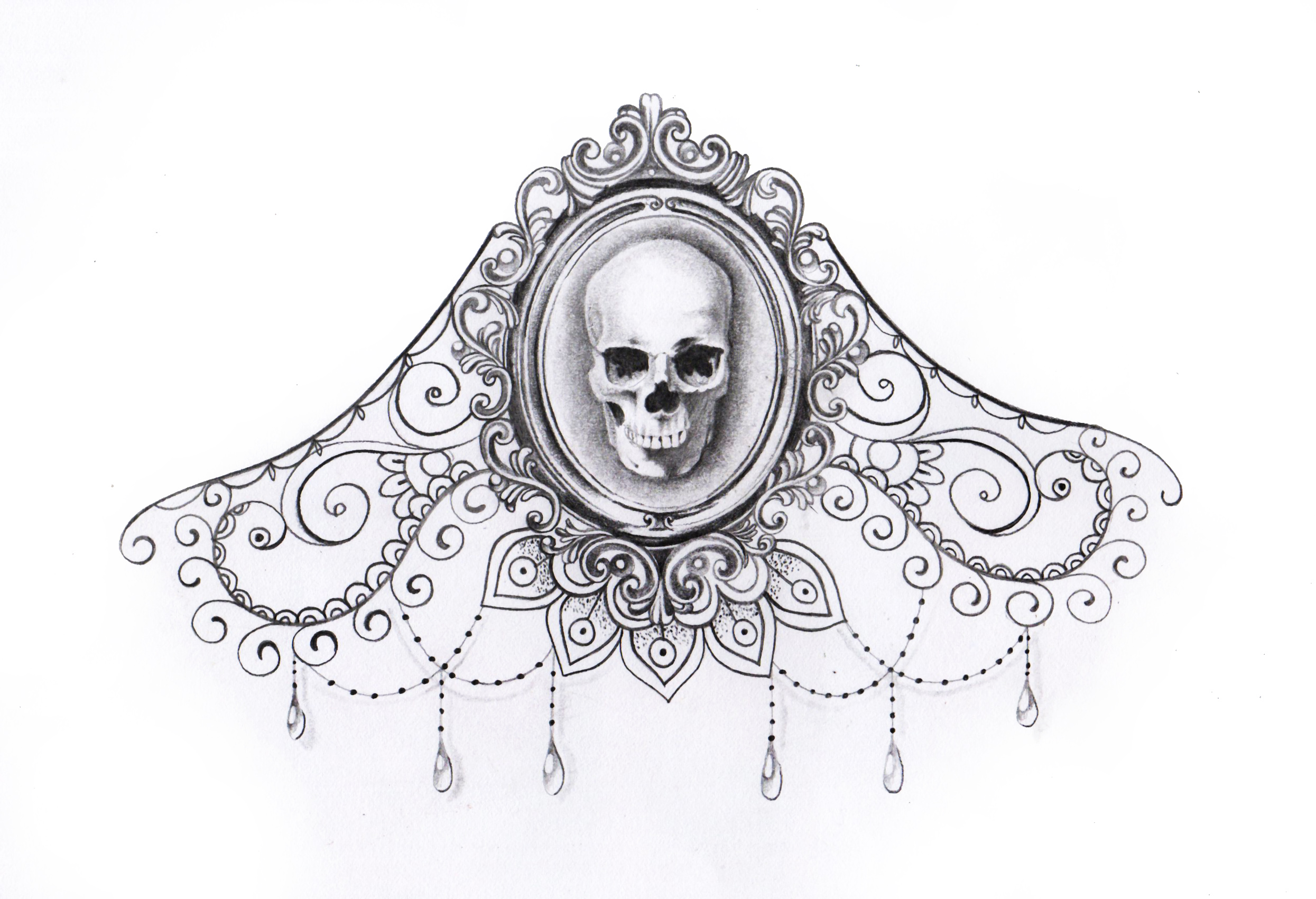 In this design, we have created a lace and jewelry style with a baroque style frame and skull in the centery. We made this withlace, pearls and diamonds.