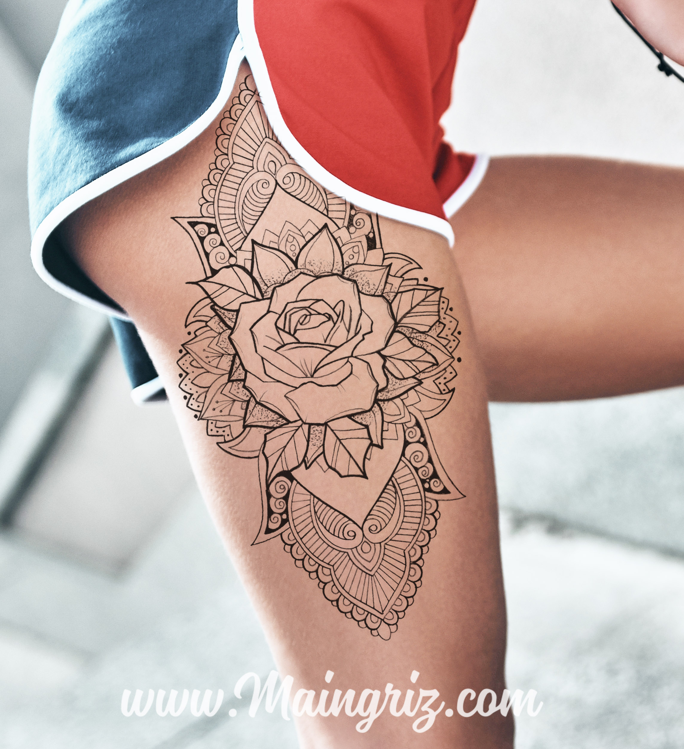 In this design, we have created a sexy rose linework with mandala tattoo in black and grey style.